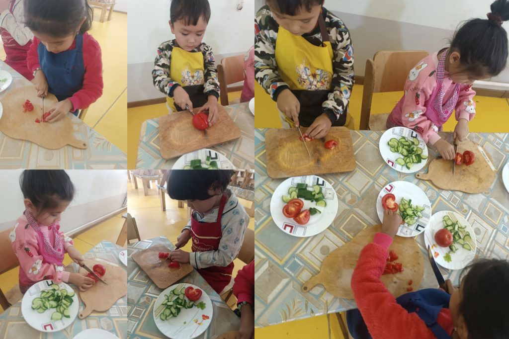 Amaliy qismda tarbiyalanuvchilar pomidor va bodring mahsulotlaridan salat tayyorlashdi. Jarayon davomida bolalarga pichoqdan ehtiyotkorona foydalanish bo‘yicha zarur ko‘rsatmalar berildi va xavfsizlik qoidalari tushuntirildi.